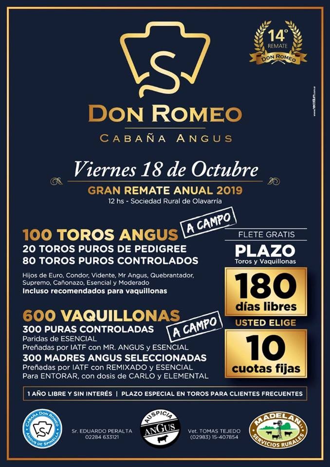 «Fundamos Don Romeo en el año 2001 y desde el primer día la visión fue generar toros de primera calidad y eficiencia, y si bien hemos ido desarrollando una línea genética que nos ha permitido obtener primeros premios en las pistas, el foco de Don Romeo ha sido ofrecer toros que brinden soluciones a las necesidades reales de nuestros clientes», afirma Spinella, titular de la empresa.La cabaña, que con su nombre busca honrar la memoria de fray Romeo Mussaragno, dará su 14° remate anual de reproductores el próximo viernes 18 de octubre en el predio de la Sociedad Rural de Olavarría. Como siempre, desde las 12 horas, la familia Spinella ofrecerá una gran recepción a sus clientes y amigos que año a año los acompañan en este gran evento de la ganadería regional.