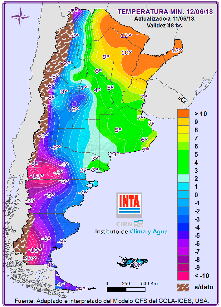 De acuerdo con el último informe del Instituto de Clima y Agua dependiente del INTA Castelar, las temperaturas descenderán por debajo de los 0°C en gran parte del territorio nacional debido al ingreso de una masa de aire frió. Además, el descenso de las temperaturas, podría estar acompañado de precipitaciones de variada intensidad.