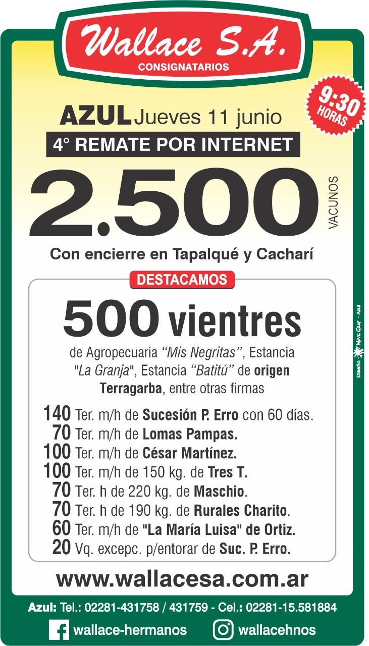 La martillada de Juanchi Wallace se verá en vivo desde las 9.30 horas por la página dispuesta a tal fin. El encierre será en Tapalqué y en Azul y se destacan 500 vientres de Agropecuaria «Mis Negritas», Estancia «La Granja» y Estancia «Batitú» de origen Terragarba en otras. Además se subastaran importantes lotes de teneros de Sucesión P. Erro (con 60 días), Lomas Pampas, César Martínez, Tres T, de Maschio, Rurales Carito y La Maria Luisa de Ortiz. Saldrán a la venta también 20 vaquillonas excepcionales para entorar de Suc. P. erro.